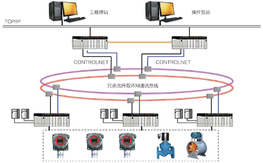 系統(tǒng)由安裝在現(xiàn)場的可燃/有毒氣體探測器和安裝在控制室內(nèi)的控制單元、數(shù)據(jù)采集模塊、工作站等組成。通過數(shù)據(jù)采集模塊對現(xiàn)場檢測器實施數(shù)據(jù)采集,并通過通訊模件完成于操作員站或第三方系統(tǒng)(設(shè)備)之間的通訊,接受相關(guān)信息并傳遞實時數(shù)據(jù)。