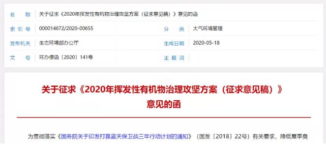 為貫徹落實《國務(wù)院關(guān)于印發(fā)打贏藍天保衛(wèi)戰(zhàn)三年行動計劃的通知》(國發(fā)〔2018〕22號)有關(guān)要求,降低夏季臭氧污染影響,前幾日,生態(tài)環(huán)境部組織編制了《2020年揮發(fā)性有機物治理攻堅方案(征求意見稿)》。