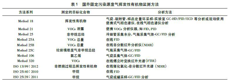 美國環(huán)保署推出的VOCs監(jiān)測方法有環(huán)境空氣VOCs分析方法、室內空氣VOCs分析方法和固定源廢氣VOCs分析方法。固定污染源廢氣多采用在線分析儀進行現(xiàn)場分析,如在線GC-MS /FID/PID/ECD 等,還可使用傅立葉變換紅外光譜和非分散紅外分析儀,還可將廢氣采集于氣袋或氣瓶中后再進行分析。國際標準化組織( ISO) 也發(fā)布了關于VOCs檢測的標準方法,對于固定源廢氣主要采用在線方法,如催化氧化-非分散紅外光譜、GC/FID 等。具體監(jiān)測方法見表1。